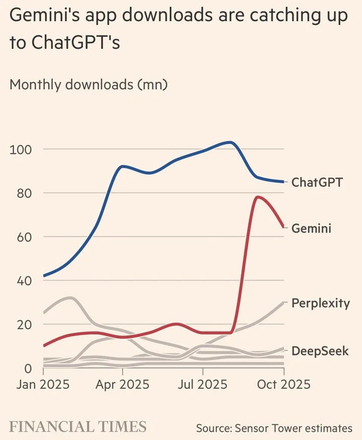 ▲ Gemini App 下載量快要追上 ChatGPT。