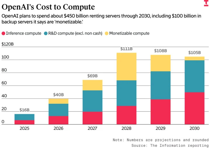 ▲ OpenAI 計算成本,到 2030 年花費約 4,500 億美元租用伺服器,紅色為推理計算成本、藍色為研發(不包含現金業務)、黃色為可盈利預測。