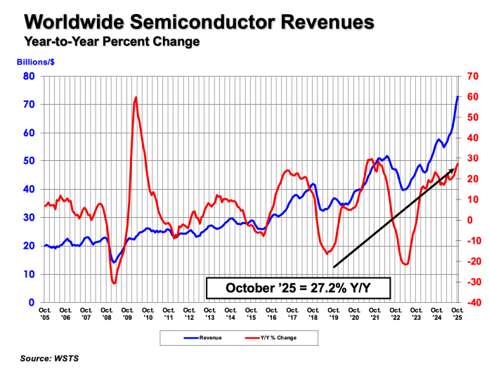 SIA表示,據世界半導體貿易統計組織(WSTS)最新的全球半導體市場預測報告,預期2025年全球半導體營收可望達7,722億美元,成長22.5%,2026年進一步攀高至9,754億美元,逼近1兆美元關卡。