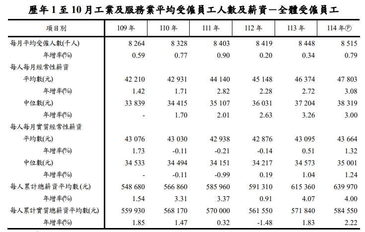 主計總處統計,今年1至10月全體受僱員工經常性薪資平均數為4萬7,803元,年增3.08%,累計總薪資平均數也成長4%。
