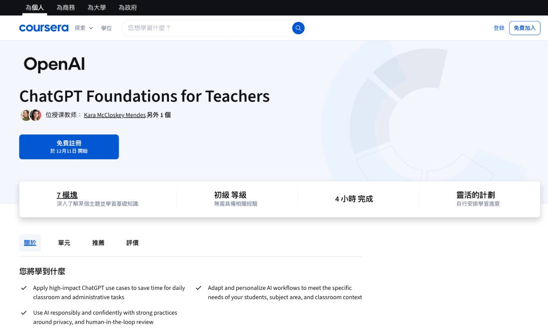 ChatGPT Foundations for Teachers 是為 K–12 教師(涵蓋幼兒園、小學、中學階段)打造的新課程,介紹 ChatGPT 的運作基礎、如何操作工具與個人化設定,以及如何將工具應用在實際的教學與行政工作。