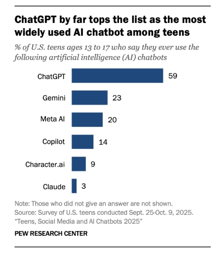 這項調查於2025年9月25日至10月9日進行,涵蓋了1,458名年齡在13至17歲之間的青少年。調查結果顯示,59%的青少年使用OpenAI的ChatGPT,這個數字遠超過其他競爭對手,如Google的Gemini(23%)和Meta AI(20%)。