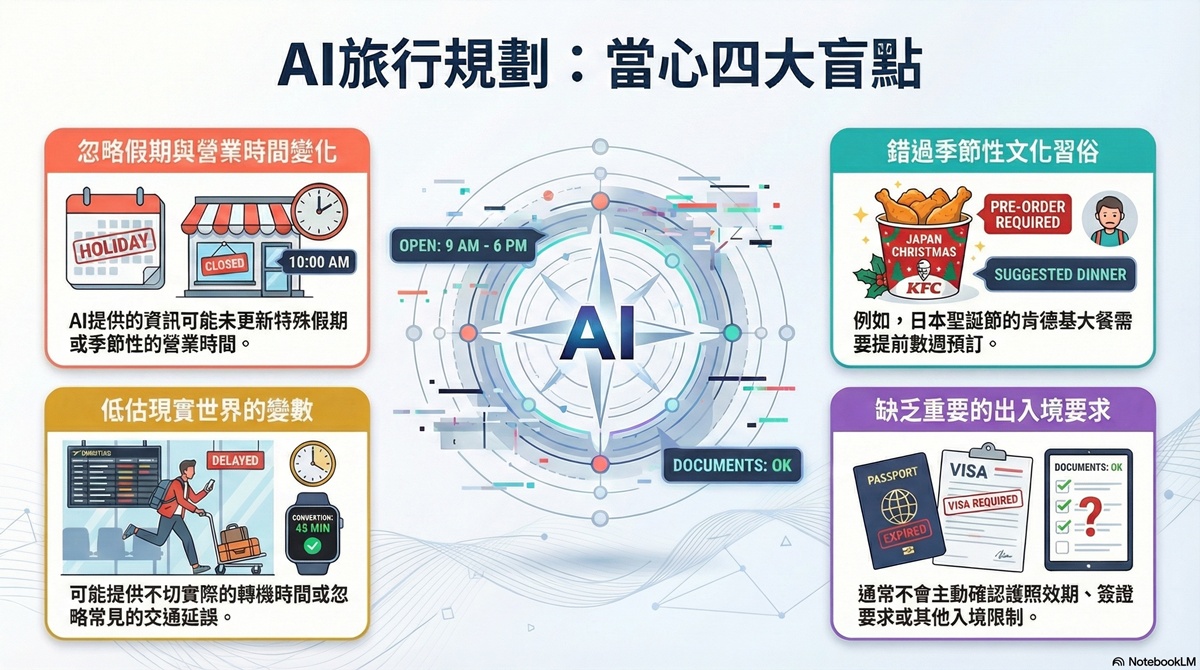 - 現實變數的忽略:AI可能會建議一個沒有考慮到達和出發登機口之間距離的航班轉機,或提供理想化的駕駛時間,忽略了常見的延誤區域。