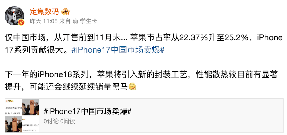 據微博爆料帳號「定焦數碼」指出,明年推出的 iPhone 18 系列,蘋果將導入新封裝製程,效能散熱較目前有顯著提升。