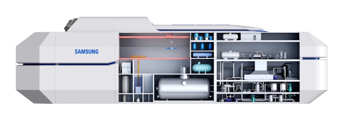 該浮動式 SMR 平台由三星重工負責整體整合與平台設計,反應爐則由韓國原子能研究院開發,採用 SMART100 一體化壓水式小型模組化反應爐。平台可搭載兩座 SMR,並透過艙室化(compartment)設計,依功能配置反應爐與發電系統,使未來僅需調整反應爐艙體,即可彈性導入不同型式的 SMR,提升平台的通用性與擴展彈性。