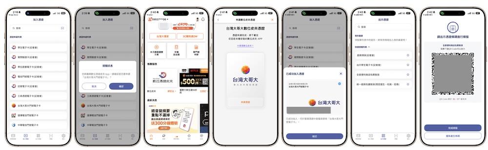 如果你也想體驗「數位憑證皮夾」,可以到 App Store/Google Play 商店下載「數位憑證皮夾」App,依照畫面指示完成註冊與手機驗證後,就能開始加入憑證。進入 App 主畫面點選「加入憑證」,系統會顯示目前可申請的憑證項目,使用者只需依序完成身分確認流程,例如手機生物辨識或簡單驗證,憑證便會自動存入手機中,不必額外攜帶實體證件。
