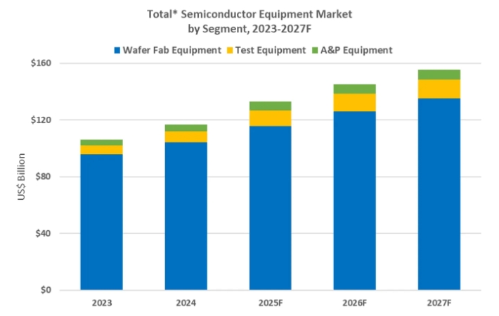 國際半導體產業協會(SEMI)16日在SEMICON Japan 2025上發表2025年末全球晶片設備市場預測報告,2025年全球晶片設備(新品)銷售額預估將年增13.7%至1,330億美元,將創下歷史新高紀錄,且預估明後兩年將持續增長,2026年預估將成長至1,450億美元、2027年成長至1,560億美元,將持續改寫歷史新高紀錄。