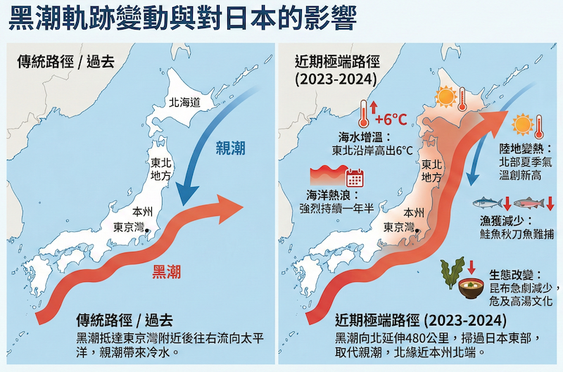 黑潮延伸段在 2023 年和 2024 年的突飛猛進是極端事件,北緣幾乎到達日本最大島嶼本州島的北端。從 2023 年 4 月到 2024 年 8 月,在整整一年半的時間裡,該地區「幾乎每天都出現強烈的海洋熱浪」。極端海洋狀況導致 2023 年日本北部陸地夏季氣溫創下歷史新高,也改變日本太平洋沿岸魚類族群的分佈,對日本漁業造成極大影響。