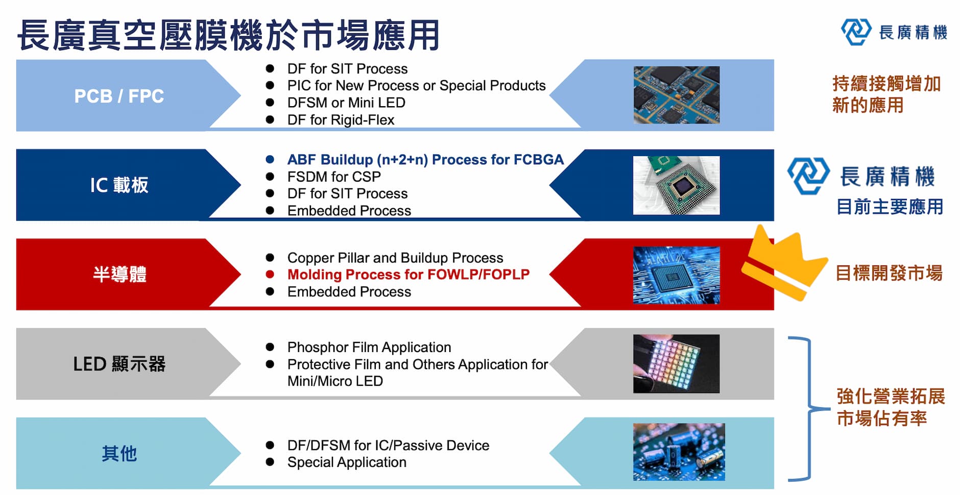 扇出型封裝方面,吳志軒指出,長廣的 PLP/FOPLP 相關真空壓膜技術,已進入台灣客戶驗證階段,有機會切入次世代半導體製程,隨著 AI 晶片面積持續擴大、封裝層數提升與新材料導入加速,高階真空壓膜設備將成為全球半導體產能擴張的重要關鍵。