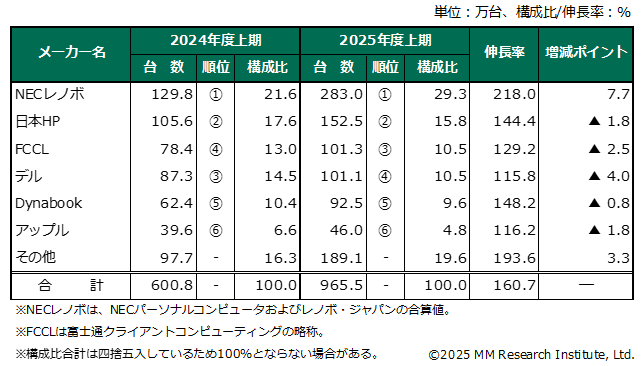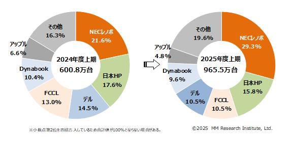 日本ICT市場調查諮詢機構MM總研(MM Research Institute)公布調查報告指出,因微軟(Microsoft)Windows 10在2025年10月終止支援推升商用PC換機需求,加上「GIGA School 構想」(日本全國中小學每位學生配置一台電腦設備)換機需求顯現,帶動2025年度上半年(2025年4-9月)日本PC出貨量較去年同期飆增60.7%至965.5萬台,就半年度別情況來看,超越2013年度下半年的960.1萬台,創1995年度開始進行統計以來歷史新高紀錄。