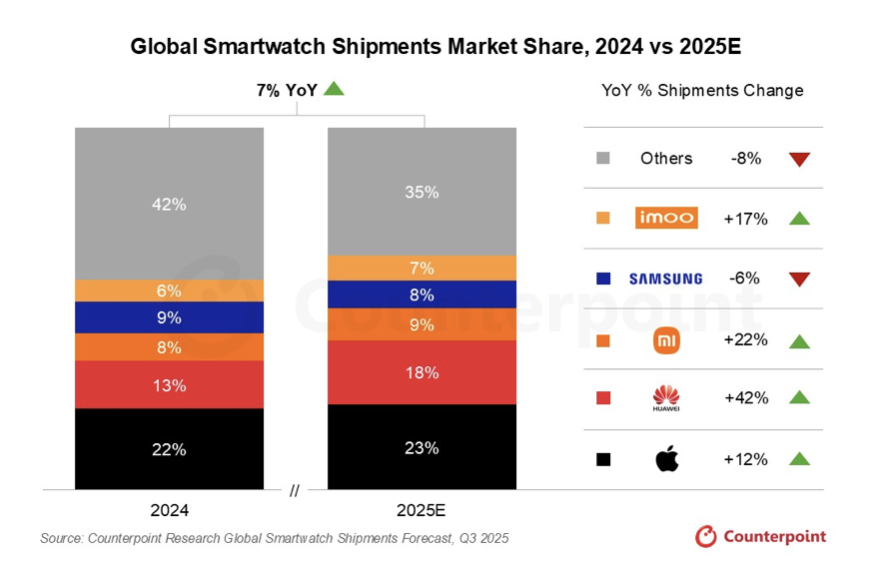 Counterpoint Research 資深研究分析師 Anshika Jain 表示,中國已成為全球智慧手錶市場最重要的成長引擎,前五大品牌中有三家來自中國。政府補貼政策推動消費者汰換,加上華為、小米與 Imoo 透過差異化策略持續提升用戶黏著度,在收入提升與強勁在地需求的帶動下,中國市場市佔率由 2024 年的 25% 提升至 2025 年預估的 31%。