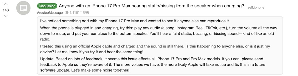 近期有 iPhone 17 Pro 與 iPhone 17 Pro Max 使用者在社群論壇與外國論壇 Reddit 上反映,手機在充電中會從喇叭傳出輕微的靜態噪音或嘶嘶聲,聲音類似老式收音機的底噪;多數描述指出噪音在充電狀態下更容易被察覺,且在安靜環境中特別明顯。