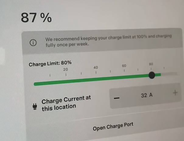 ▲特斯拉 LFP 電池車款會顯示建議每週一次充到 100%。
