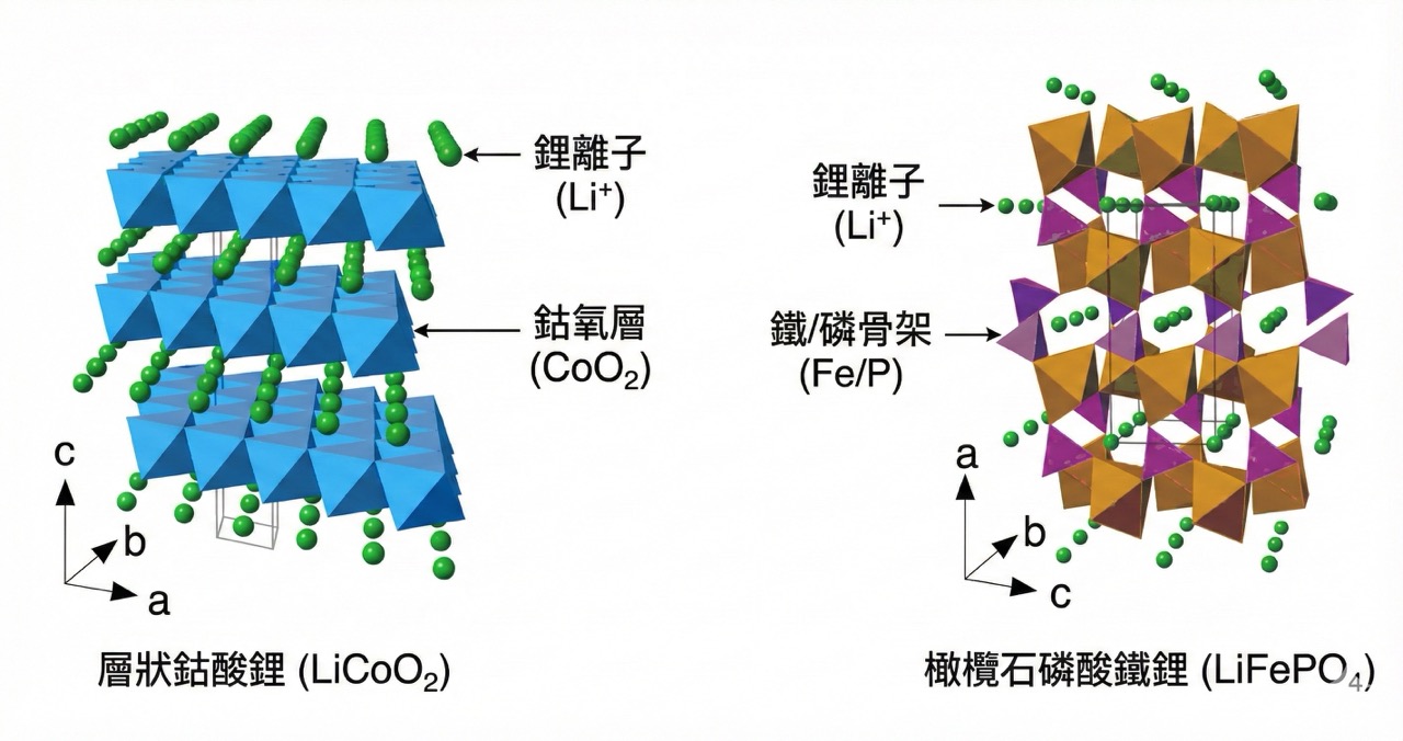 ▲LFP 與 NCM 正極材料結構對比。(Source:Gemini 生成)