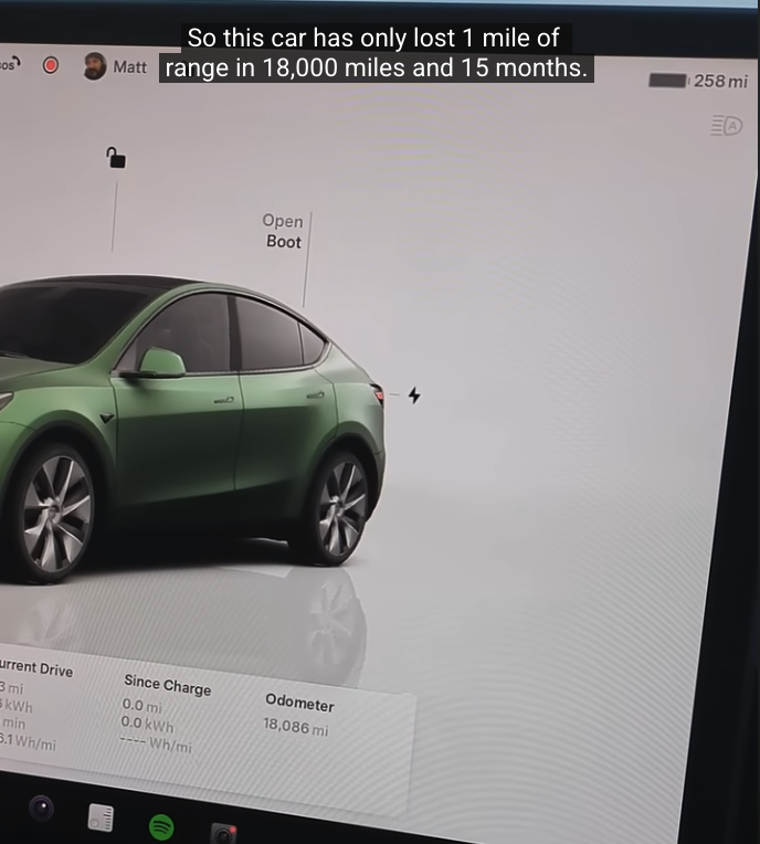 ▲美國車主分享它的後驅版 Model Y LFP,經過一年 1.8 萬英里後,續航里程只少了 1 英里。(Source:影片截圖)