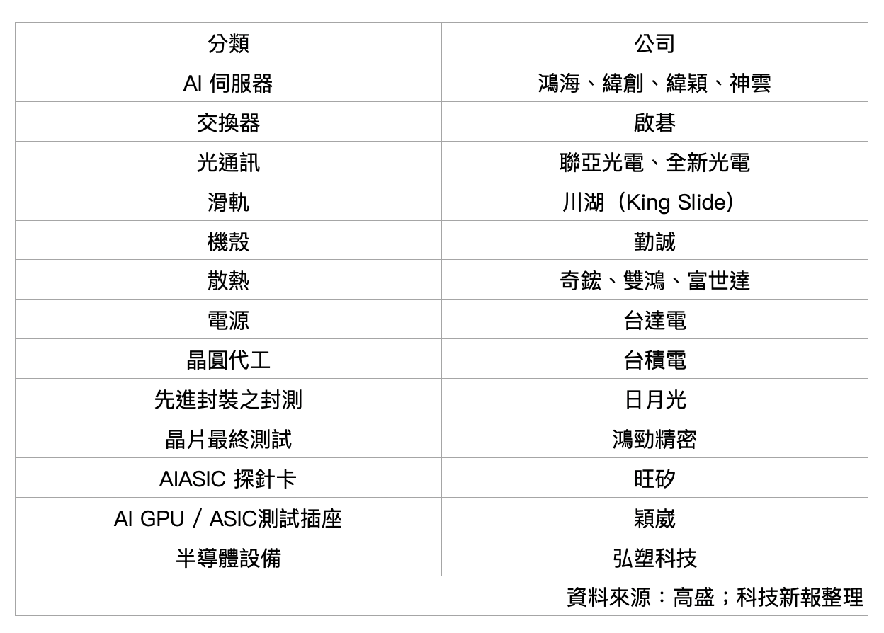 在伺服器部分,高盛建議買鴻海、工業富聯、緯創、緯穎、神雲;交換器部分建議買進啟碁;零組件部分,建議光通訊部分選擇可聯亞光電、全新光電;滑軌川湖(King Slide);機殼選擇勤誠(Chenbro);散熱選擇奇鋐、雙鴻、富世達(Fositek);電源選擇台達電。
