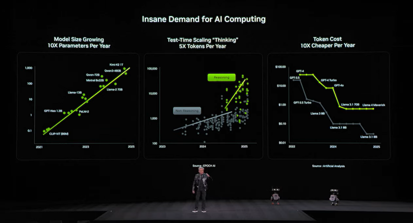 針對 AI 技術的演進,黃仁勳提到一個關鍵轉折點,那就是 AI 正從單純的一次性回答(one-shot answer)轉化為具備思考過程的模式。這種轉變源於強化學習與測試時擴展技術的引入。不同於以往的監督式微調或模仿學習,現在的 AI 透過不斷嘗試與迭代來學習如何執行任務。黃仁勳解釋說,我們可以看到 AI 在思考,雖然思考時間變長,但往往能產出更好的答案,而這種思考導致推理過程產生的tokens 數量每年以 5 倍的速度成長。