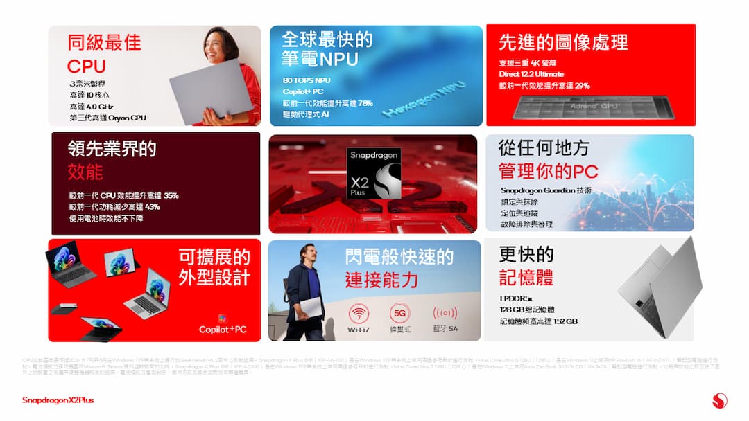 高通指出,Snapdragon X2 Plus 可透過輕薄、超便攜的 Windows 11 Copilot+ PC 提供極速效能與流暢的多工處理。