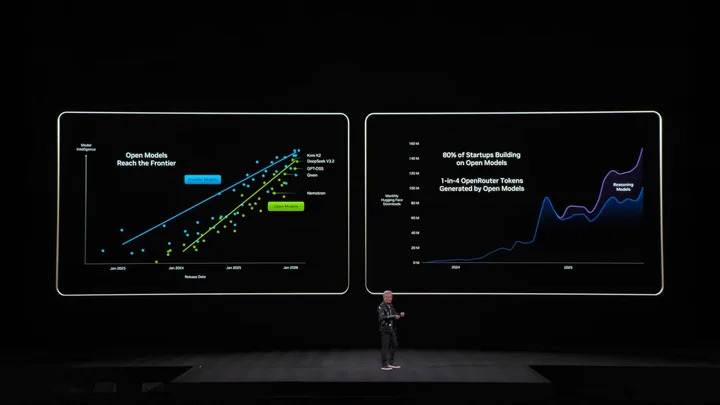 且他對開源社群評價很高。黃仁勳直言去年 DeepSeek-V1 讓全世界意外,不只是第一個開源推理 AI,更激發整個行業發展浪潮,PPT 還秀出 Kimi k2 和 DeepSeek-V3.2 是開源第一和第二。