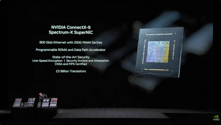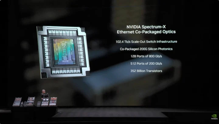 但只擴充容量當然不夠,要讓分布幾十個機架、上萬塊 GPU 的「便條紙」像同塊記憶體合作,網路必須同時「夠大、夠快、夠穩」,這就輪到 Spectrum-X 登場了。Spectrum-X 是輝達全球首款「專為生成式 AI 設計」的點到點乙太網網路平台,最新 Spectrum-X 採台積電 COOP 製程,整合矽光子,512 通道 × 200Gbps 速率。