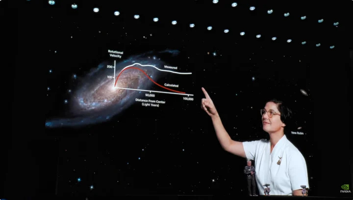 老黃直接把一台 2.5 噸重 AI 伺服器機架搬上舞台,引出發表會重點:Vera Rubin 計算平台,以發現暗物質的天文學家命名,目標只有一個: