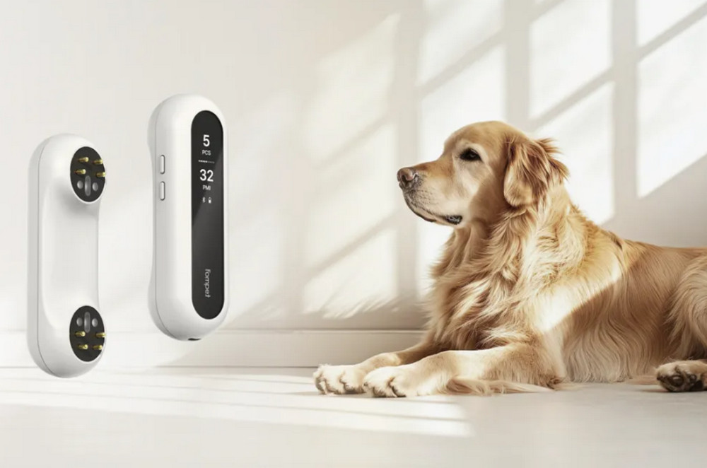 CES 2026 現場也展示多款聚焦不同健康需求的寵物科技產品。Petground 推出的 Fompet(見下圖)聚焦高齡寵物健康管理,鎖定五歲以上寵物易出現的肥胖問題。裝置只需貼於腹部 15 秒,即可量測肥胖分級(PCS)與健康指數(PMI),協助飼主及早發現心臟病、關節炎與糖尿病等風險,並透過 App 提供預防建議,強化日常照護。