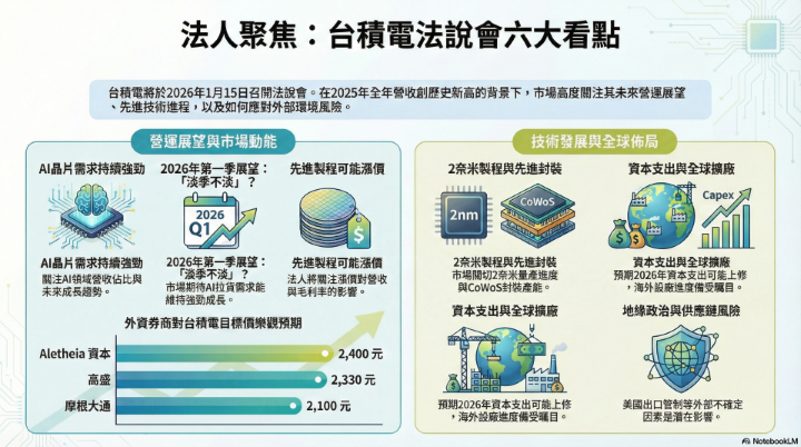 2025 年第四季與全年營收方面,法人期待公布最新營運數據,尤其營收、毛利率及獲利能力的表現。還有,對 2026 年第一季展望,外界關注台積電是否能達成「淡季不淡」,是否因 AI 晶片拉貨與先進製程需求而維持強勁成長。