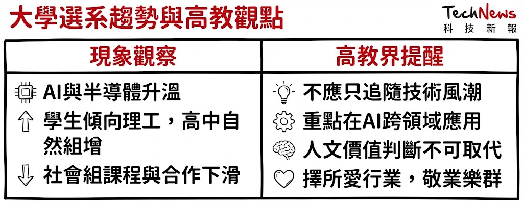 人工智慧(AI)與半導體產業持續升溫,也逐步改變學生的選系思維。多所大學觀察到,近年學生在升學選擇上明顯傾向理工領域。高教界提醒,教育不該只跟著技術或就業風潮走,更應重視培養跨領域及面對人生的態度。
