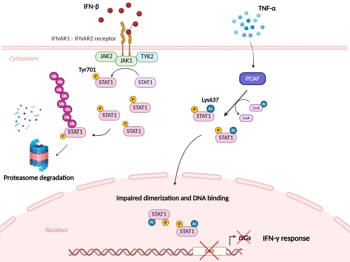 造成癌細胞「抗壓性」的核心機制在於,當腫瘤長期受到標靶藥物壓制時,會分泌大量發炎因子  TNF-α,進而干擾 STAT1 這個原本負責啟動干擾素抗腫瘤基因的關鍵因子,形成所謂的「干擾素疲乏」(IFN-γ fatigue),讓免疫細胞對癌細胞的攻擊能力逐漸喪失。