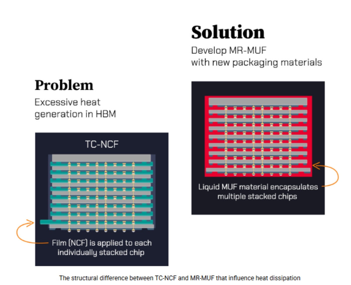 根據 SK 海力士網站,MR-MUF 結合回焊(reflow)與模封(molding)製程,在一次回焊完成多層晶片堆疊接合後,以液態環氧模封材料(EMC)填充晶片間與微凸塊間隙。