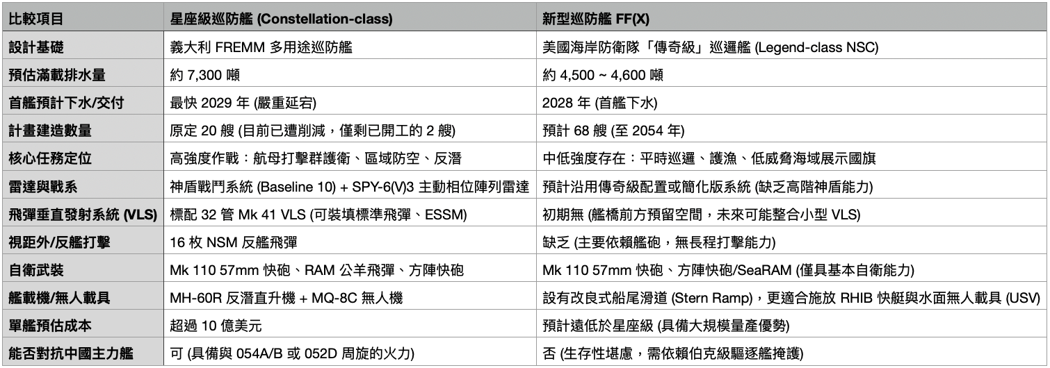 但從上表可看出 FF(X) 並非星座級的「替代品」,而是戰力上的「降級版」,美軍用犧牲約 3,000 噸的排水量與關鍵的區域防空能力(VLS),換取了約 5 到 6 年的交艦時間優勢以及 3 倍以上的艦隊數量。