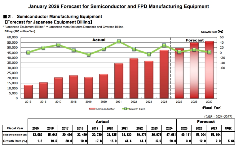 SEAJ公布預估報告指出,因台灣晶圓代工廠(台積電)的2奈米(GAA)投資全面展開,加上以HBM為中心的DRAM投資穩健,因此2025年度(2025年4月-2026年3月)日本製晶片設備銷售額(指日系企業於日本國內及海外的設備銷售額)自前次(2025年7月)預估的4兆8,634億日圓上修至4兆9,111億日圓、將較2024年度增加3.0%,年銷售額將連續第2年創下歷史新高紀錄。