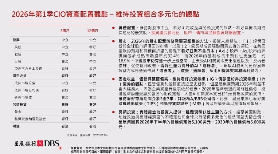 陳昱嘉表示,總經面受到 AI 資本支出、財政刺激和貨幣寬鬆的支撐,星展集團認為 2026 年美國經濟可望避免陷入衰退,但仍需留意持續存在的赤字和日益增加的財政主導風險,削弱美國聯準會(Fed)的獨立性,並重新推升通膨壓力。