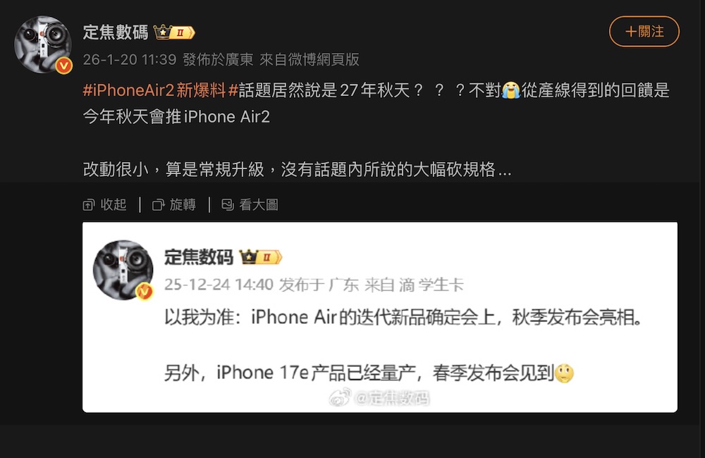 該名爆料者重申去年底曾提出的說法,指出從產線回饋來看,iPhone Air 2 仍預計在秋季亮相,推測將與 iPhone 18 Pro 系列,以及傳聞中的摺疊式 iPhone 一同發表。