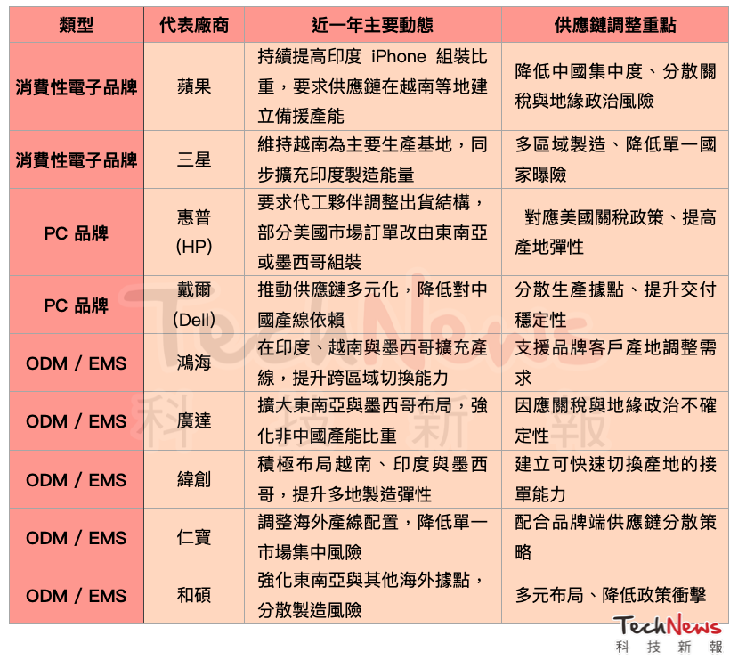 具體來看,品牌與 ODM/EMS 廠商近一年已明顯加快產線分散腳步。以主要消費性電子品牌為例,蘋果持續拉高印度組裝比重,iPhone 與部分配件產線已不再高度集中於中國,同時也要求供應鏈在越南與其他東南亞國家建立備援產能;三星則延續既有的越南生產重心,並逐步擴充印度製造能量,分散對單一市場與關稅政策的曝險。