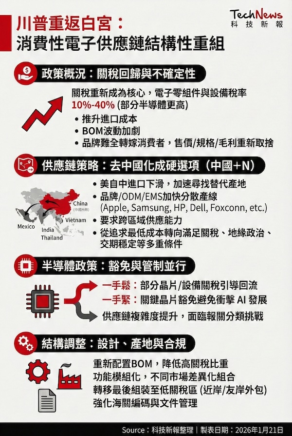 川普重返白宮後的第一年,透過關稅、供應鏈安全與在地投資誘因,再度拉高全球消費性電子產品的成本與不確定性,也加速供應鏈「去中國化」與區域化布局。這些變化並非從零開始,而是在 2018 年後已逐步成形的轉移趨勢上「再加碼」,使供應鏈調整從可選策略,轉為品牌與代工廠不得不面對的結構性課題。