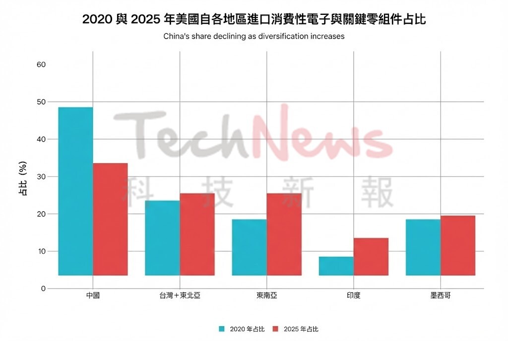 供應鏈多元化原本就是消費性電子廠商近年的長期策略,但川普第二任期的貿易政策,實質上將「降低對中國依賴」推向更具強制性的階段。研究機構統計,2025 年上半年美國自中國進口金額明顯下滑,顯示企業已加速尋找替代產地與組裝據點。