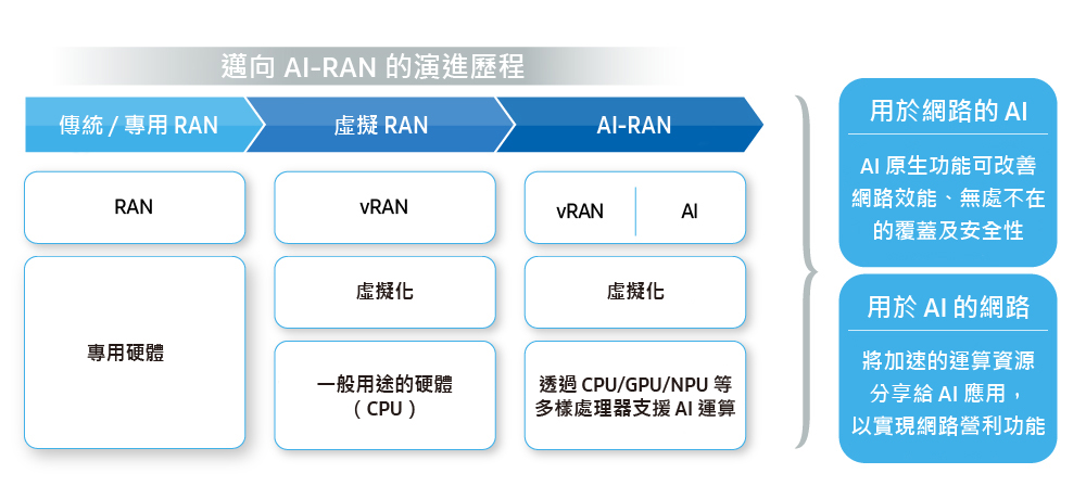 AI-RAN 是「人工智慧無線接入網路」,簡單來說,是將 AI 深入整合進傳統行動通訊網路(即 RAN)中,使基地台除了執行通訊外,還能進行 AI 運算來分析數據,以提升網路效能、能源效率,並支援邊緣 AI 應用。