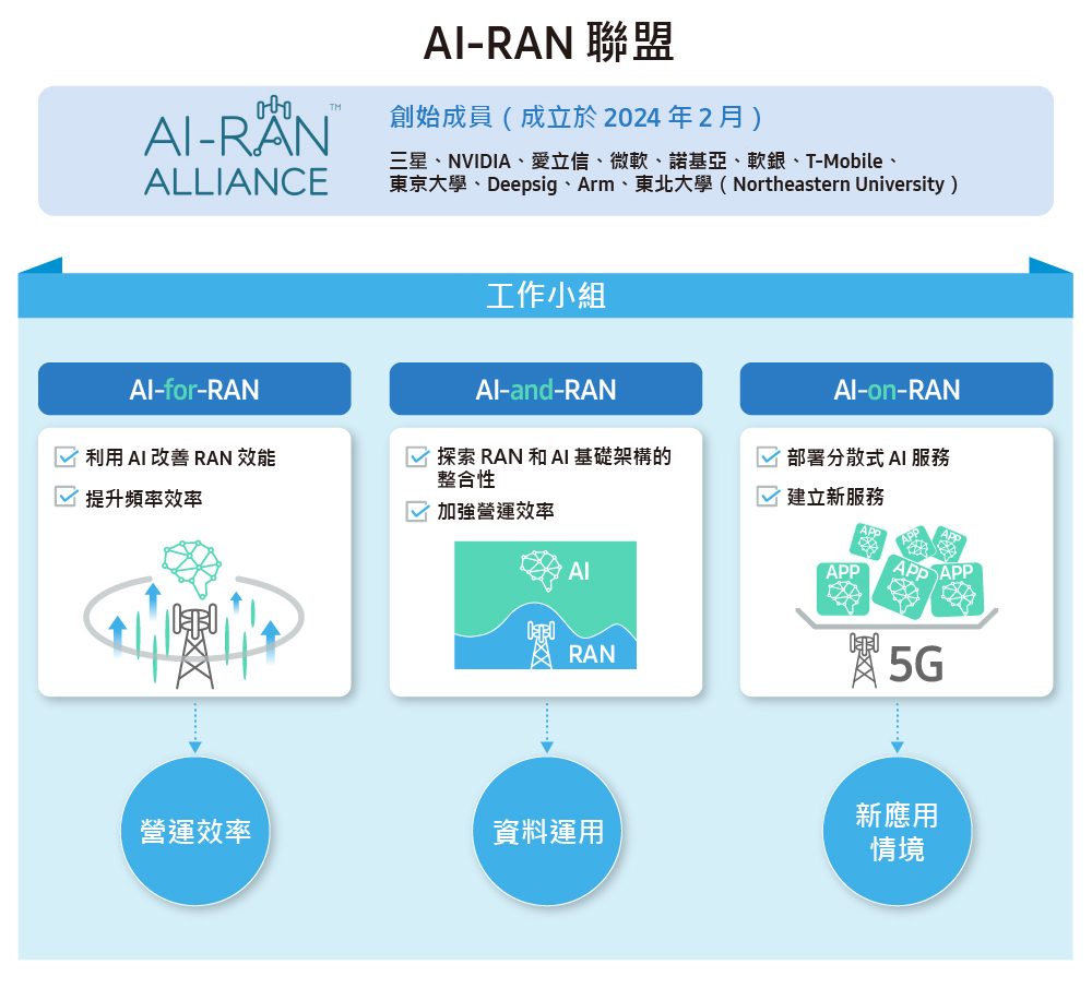 目前 AI-RAN 聯盟是研究「AI-for-RAN」、「AI-and-RAN」和「AI-on-RAN」,目標是提升營運效率、資料運用以及新應用情境。