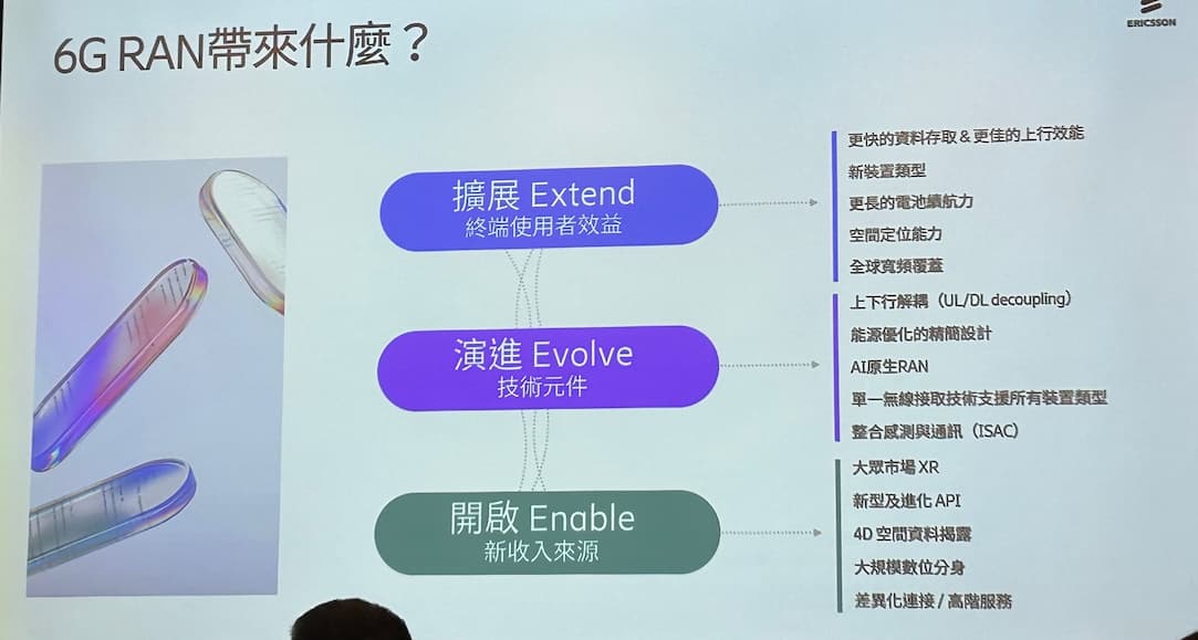 接著談到 6G RAN(Radio Access Network),有三個核心概念,即擴大終端使用者價值(Extend)、導入新的技術元件(Evolve)以及開啟新的收入來源(Enable)。