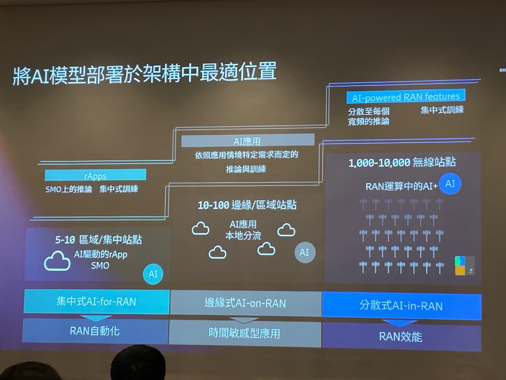 最後一種是「AI-in-RAN」,專攻 RAN 效能,是將 AI 演算法直接內嵌於設備中,以實現即時、低延遲的決策能力。這主要是為了提升某一個站點的覆蓋品質,必須動態調整功率等相關參數,本質上是單一基站層級的問題,因此數量將是數以萬計的基站。
