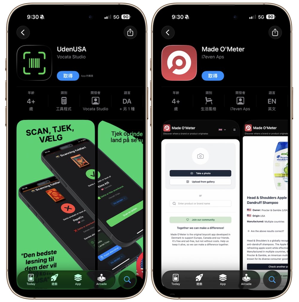 這兩款 App 的運作方式相近,皆是透過掃描商品條碼,向使用者顯示產品的生產地或企業背景,並協助消費者判斷是否涉及美國品牌或資本來源。其中 Made O’Meter 將自身定位為「提升全球供應鏈透明度」的購物輔助工具;相較之下,NonUSA 則更直接主打協助使用者在日常生活中避開美國產品,並推薦丹麥本土替代選項。