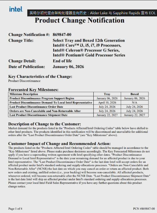 英特爾 2025 年已停產多款型動版 Alder Lake 處理器,此次 EOL 含括了完整的桌上型電腦平台陣容,包括盒裝與散片產品,從入門級 Celeron 到旗艦級 Core i9 均在列。不過,Alder Lake 庫存並不會立刻蒸發,英特爾允許管道商在 2026 年 7 月 25 日前提交最終訂單,最後一批產品的出貨時間定在 2027 年 1 月 22 日,這意味著市場仍有一整年的緩衝期進行庫存清理。