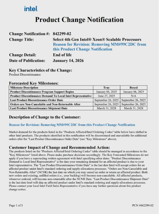 根據英特爾揭露的資訊指出,Sapphire Rapids Scalable 已於 2025 年 9 月 26 日停止接受新訂單,最終出貨日期為 2028 年 3 月 31 日。同樣,這一系列的技術支援也將後續轉入 Intel Embedded Architecture。值得注意的是,英特爾隨後更新了停產清單,將 Xeon Gold 6414U 從 EOL 名單中移除,確認該型號仍繼續保持供貨。
