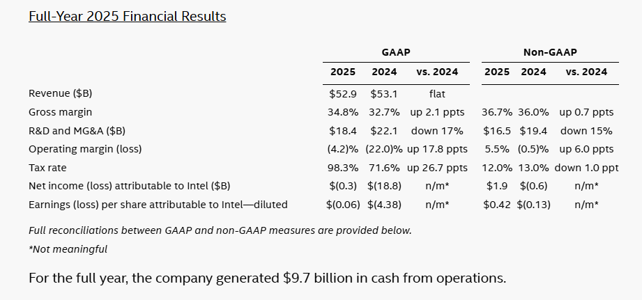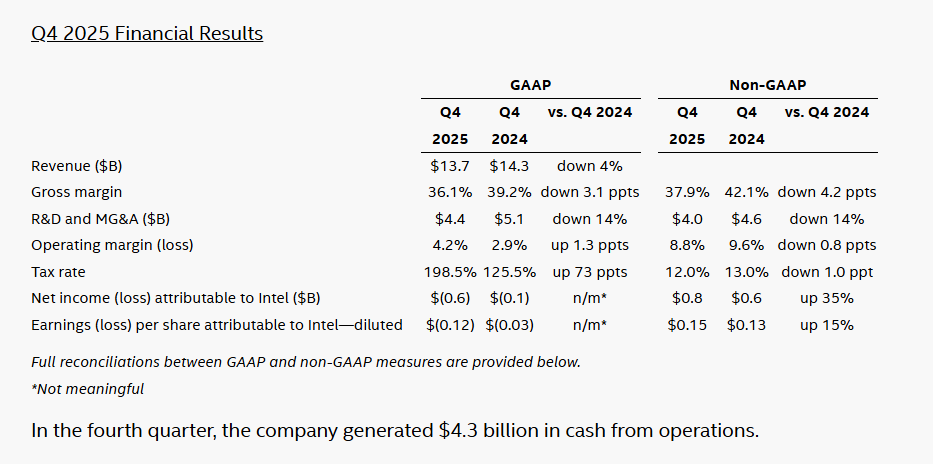 根據倫敦證券交易所集團 (LSEG) 的分析師調查數據,英特爾第四季的表現好壞參半。雖然核心獲利指標超越了市場預期,但淨虧損金額卻較 2024 年同期顯著擴大。