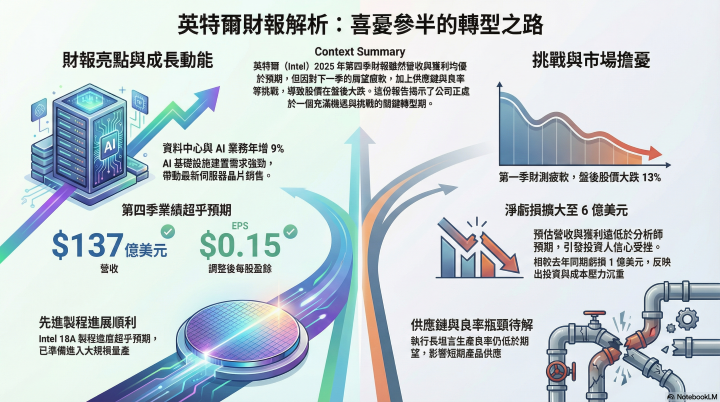 英特爾本次財報揭示了該公司正處於極其複雜的轉型期。一方面,AI 帶動的資料中心需求成長,以及 Intel 18A 製程的技術突破令人振奮。另一方面,傳統 PC 市場的萎縮、擴大的淨虧損以及短期供應鏈瓶頸導致的疲軟財測,則讓投資人選擇先獲利了結。