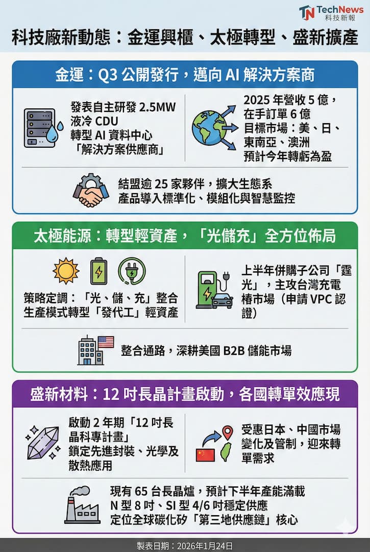 廣運與集團各子公司太極、盛新、金運、群豐及永暘今日舉辦年度尾牙,適逢 50 週年,董事長謝明凱定調以「AI 與數位化」作為新成長引擎,受惠智慧製造、半導體物流及公共工程等布局發酵,目前在手訂單規模達 60 億元,並分享金運興櫃、盛新啟動 12 吋長晶科專計劃的消息。