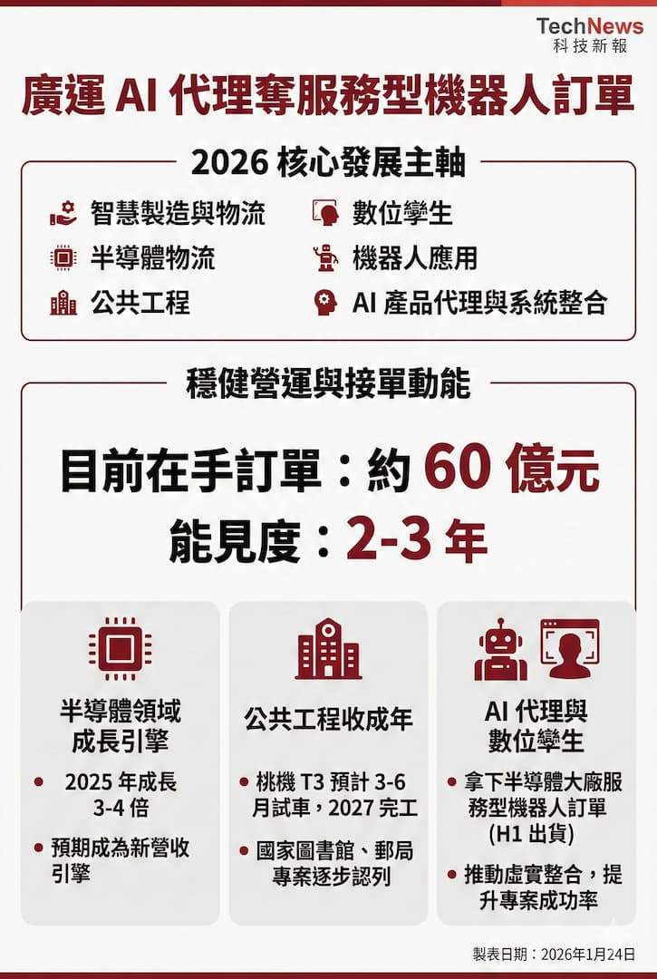 廣運機械總經理為柯智鈞表示,2026 年以智慧製造與物流、半導體物流、公共工程、數位孿生、機器人應用、AI 產品代理與系統整合為核心發展,受惠各大產品線發酵,目前廣運在手訂單約 60 億元,能見度已達 2~3 年。