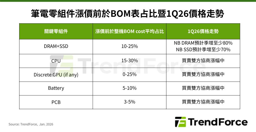 從記憶體端分析,預估2026年第一季筆電用DRAM與SSD的合約價格將分別季增80%、70%以上,上行幅度高於預期,加上筆電品牌自2025年第四季起積極出貨,使得記憶體庫存週數快速下降。然2026年第一季開始,因品牌在記憶體原廠的供貨滿足率(fulfill rate)下降,開發記憶體貨源的彈性受限制,導致影響生產排程、出貨節奏。