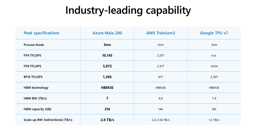 如同輝達(Nvidia)本月初發表的下一代旗艦Vera Rubin晶片,微軟的Maia 200晶片也是由台積電以3奈米製程生產,並將採用高頻寬記憶體,不過與輝達即將問世的晶片相比,所用的記憶體屬於較舊且速度較慢的一代。
